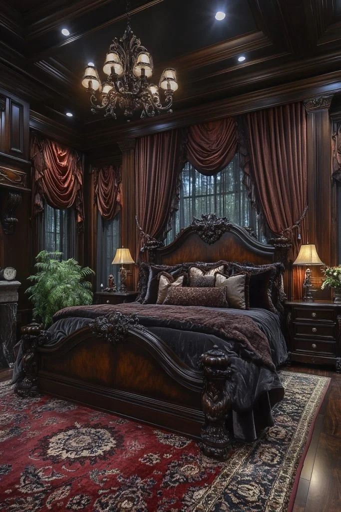 Create a cozy, intimate setting with a dark wood rustic bedroom. Use rich, dark-stained timber for your bed frame, nightstands, and wardrobe to evoke a sense of warmth and shelter. Complement these with deep, warm-toned bedding and subdued lighting to enhance the ambiance. This style is perfect for creating a restful, secluded retreat.