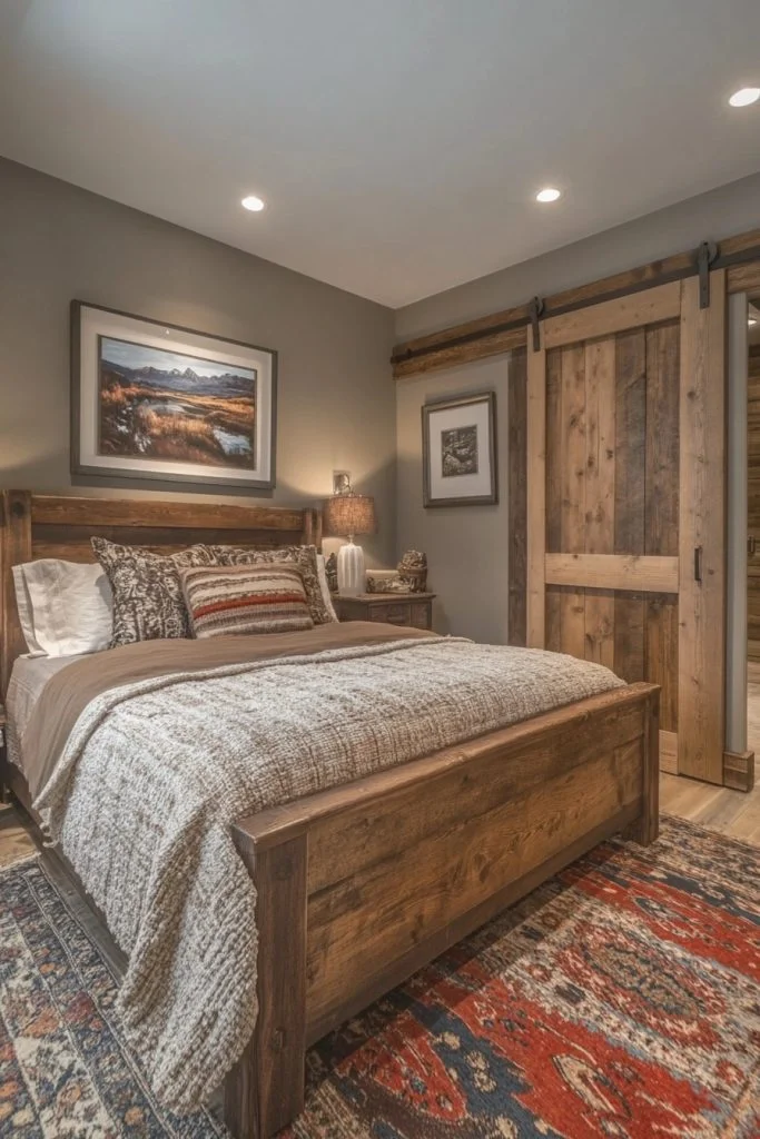 Incorporate barn door features in your rustic bedroom for a charming and functional touch. Use a sliding barn door for the closet or en-suite bathroom to save space and add a rustic aesthetic. The natural wood and hardware of barn doors complement rustic decor perfectly, adding both style and practicality. This idea is ideal for bringing a bit of countryside flair into your bedroom.