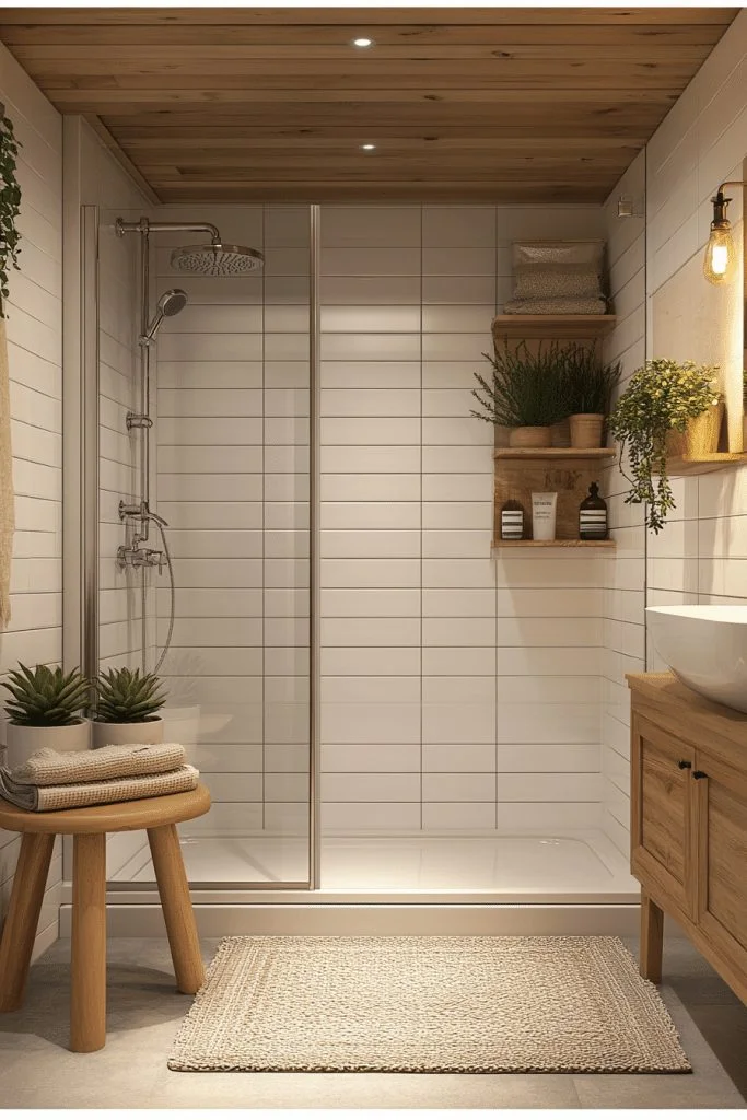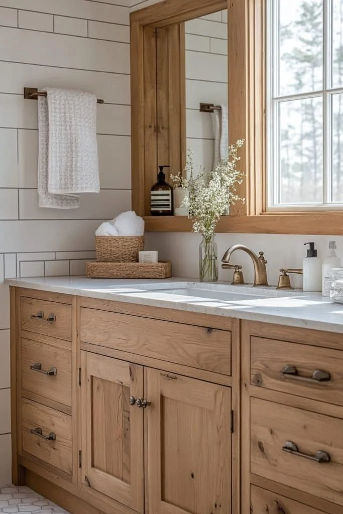 Warm Wooden Accents bring a natural, cozy feel to a small bathroom. Integrating wooden elements through vanity cabinets, floating shelves, or teak bath mats adds warmth and texture. Pair wood with neutral colors and simple hardware to maintain a clean and modern look. Soft lighting enhances the wood’s natural grain and creates a comforting ambiance.