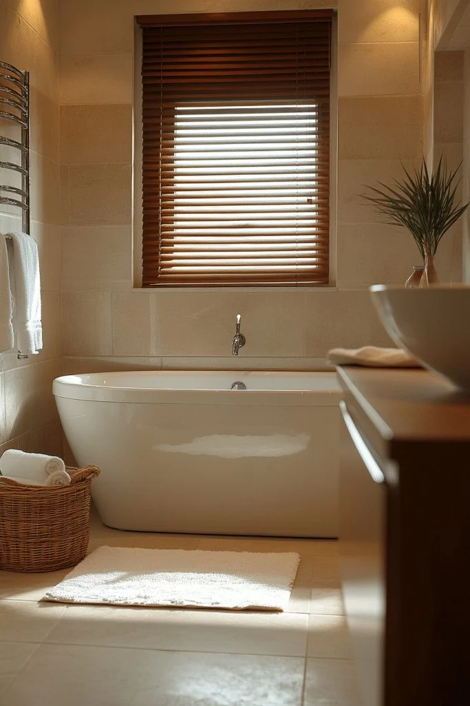 A Soft Neutral Palette is ideal for expanding the visual space. Using shades of beige, taupe, and ivory can make the bathroom feel warmer and more inviting than stark whites. These colors reflect light well, helping to make the space appear larger and brighter. Textural elements like a plush bath rug or waffle weave shower curtain add interest without introducing clutter.