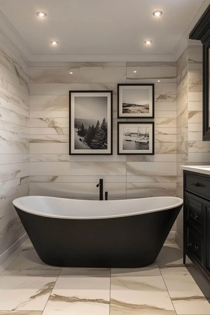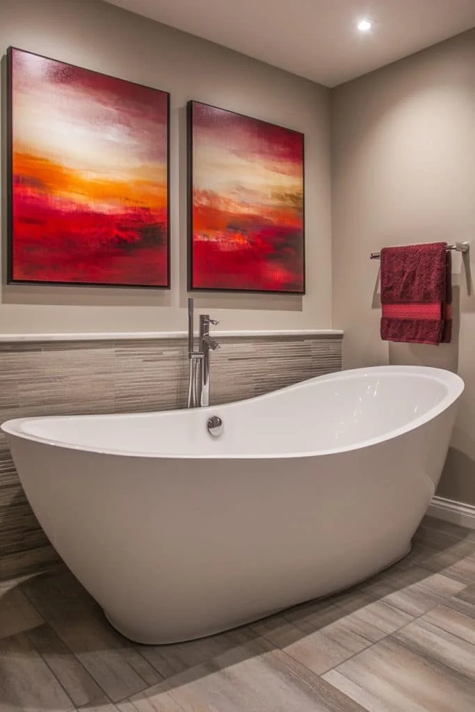 Contemporary Artistic Flair adds personality through bold artwork, colorful accents, and unique decorative touches. This style allows for personal expression and can make the space feel larger by drawing attention to carefully selected art pieces. Keep the base elements like walls and fixtures neutral to let the art stand out. Ideally suited for those who see their bathroom as an extension of their artistic taste.