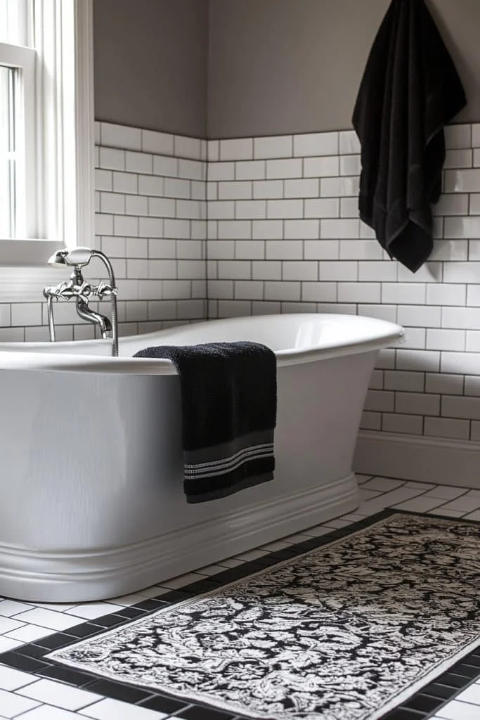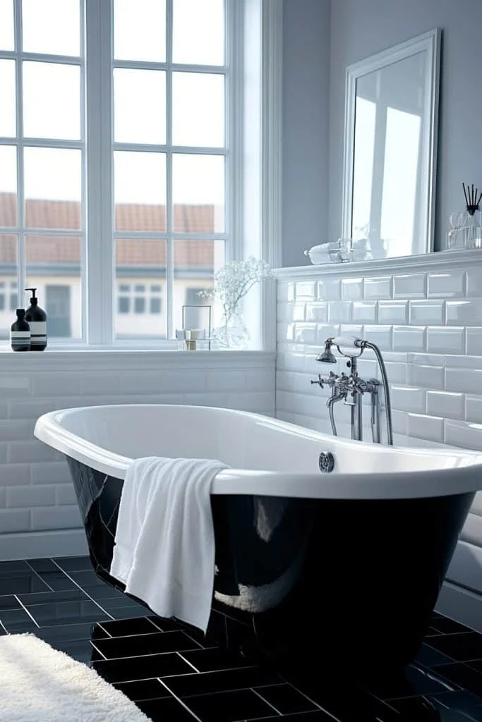 Black and White Contrast creates a dramatic impact, making the space appear more defined and stylish. This timeless color scheme can be implemented through tiles, decor, and textiles. It allows for a clear visual structure that can make the bathroom feel larger by defining the space distinctly. Minimal accessories and sleek fixtures complement this bold aesthetic.
