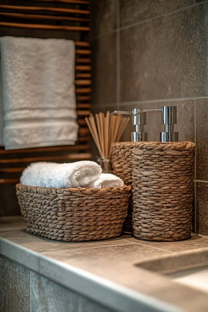 Subtle Textural Interplay adds depth and interest without the need for bright colors. Using different materials such as stone, tile, and wood with varied textures enhances the bathroom’s aesthetic while keeping the color scheme neutral. This design strategy engages the senses and adds sophistication. Keep fixtures minimal and sleek to maintain a unified look.