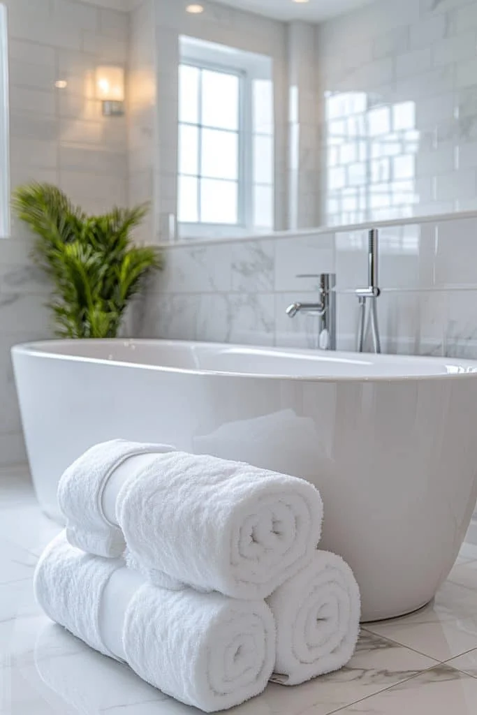 A Serene White Haven uses various shades of white to create a peaceful and calming small bathroom. This monochromatic approach reflects light and gives an illusion of more space. Soft textures, such as fluffy white towels and a plush rug, add comfort without clutter. The use of white extends to fixtures and cabinetry, creating a seamless look.