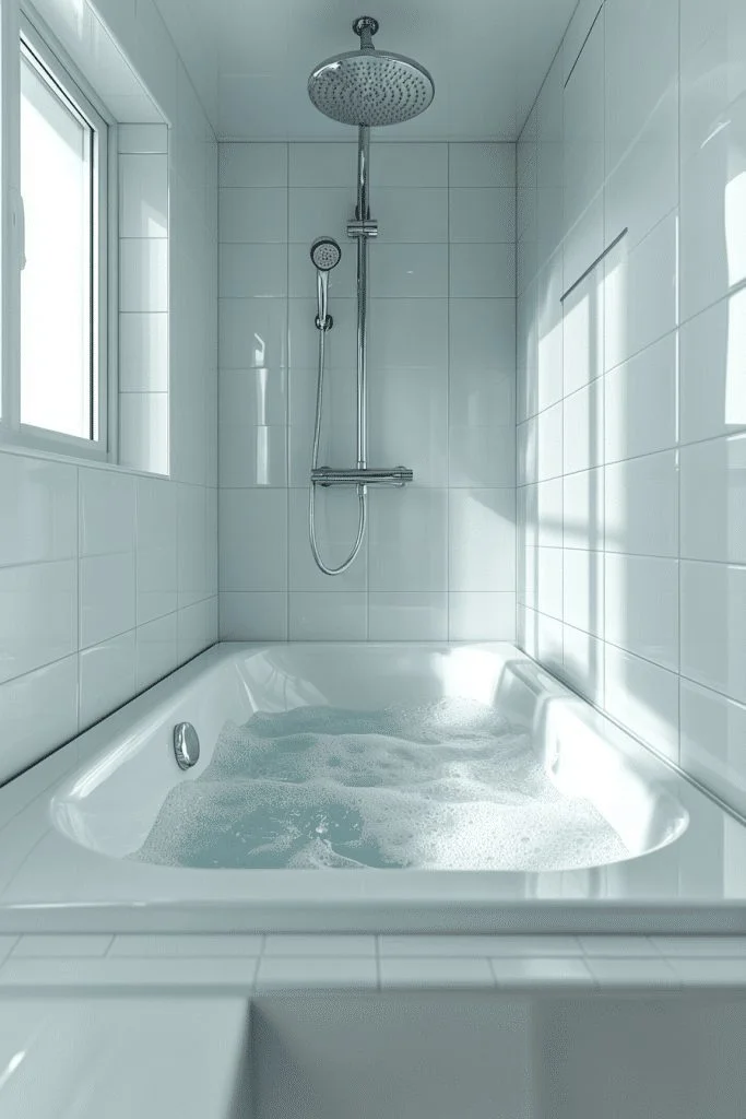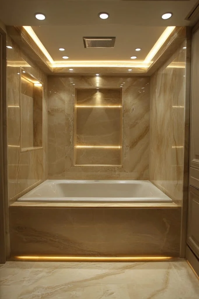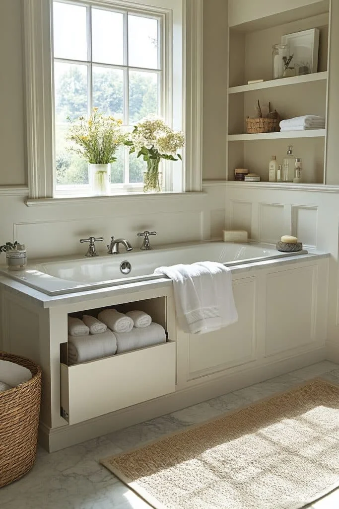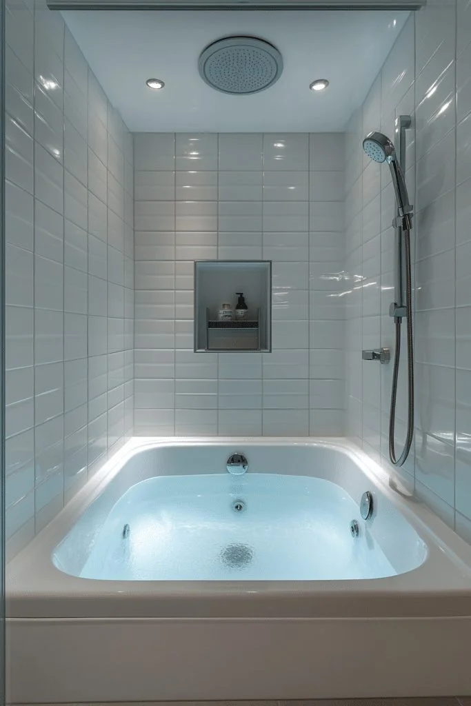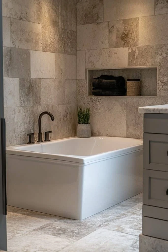 A streamlined tub with shelving utilizes the vertical space above the tub for storage. Recessed niches built into the tiled wall provide a place to store toiletries without encroaching on the bathing area. This setup keeps essential items handy while preserving the clean lines of the bathroom. Opt for niche tiles that complement the main wall tile for a cohesive look.