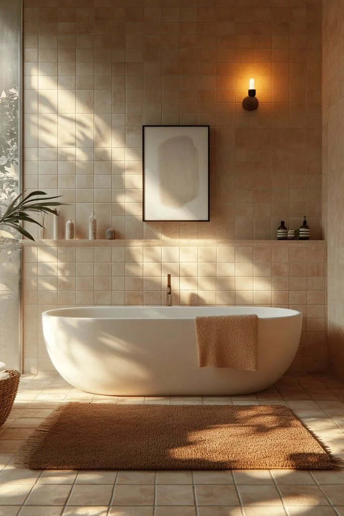 Incorporating warm wood accents can add a natural feel to the space. Use wood for a tub tray, a floating shelf, or even a teak floor mat to create a cozy atmosphere. Pair this with creamy tiles and soft lighting to enhance the warmth of the wood. This approach can make even the smallest bathroom feel welcoming and spa-like.