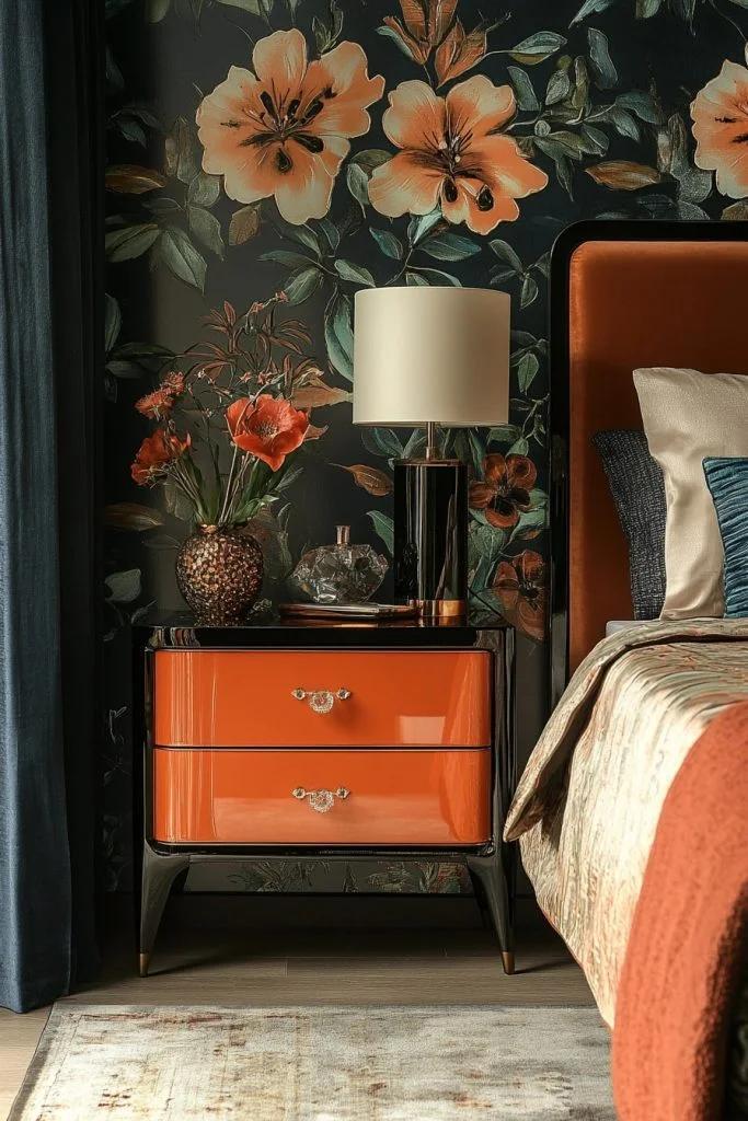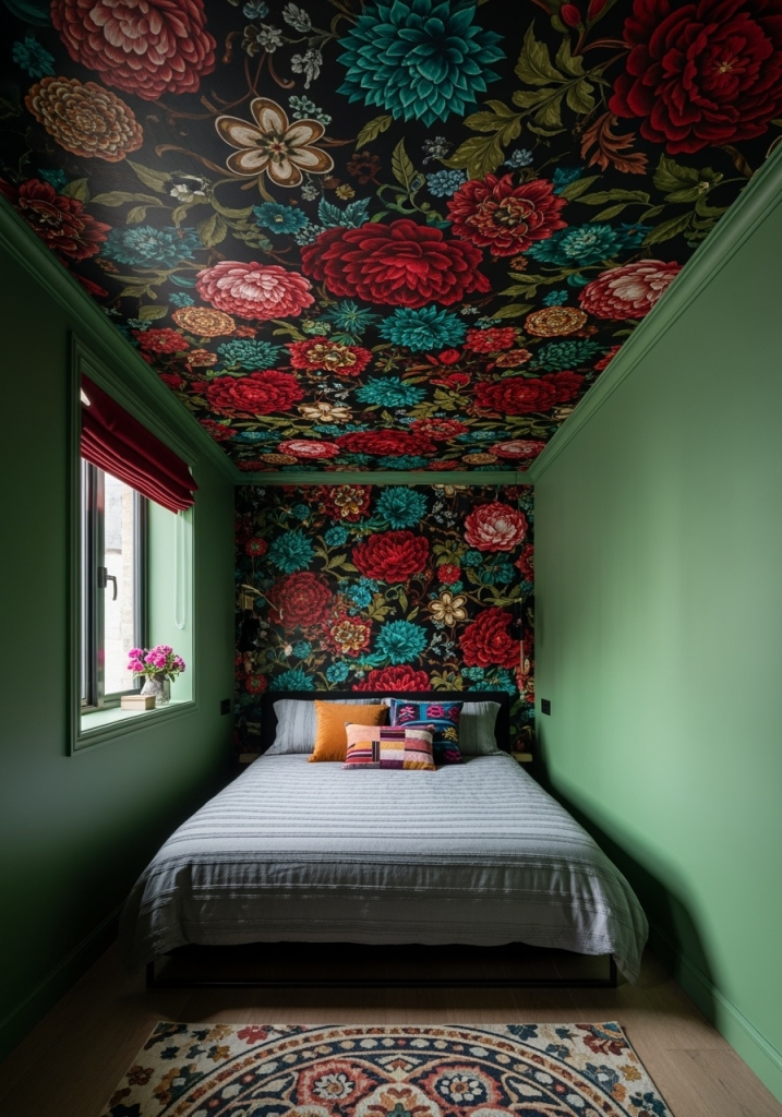 For an unexpected and truly maximalist touch in a small bedroom, turn your ceiling into a statement piece with bold wallpaper. Choose a vibrant, large-scale patterned wallpaper—perhaps a dramatic floral, a geometric print, or an ornate damask—and apply it directly to the ceiling. This draws the eye upward, making the room feel taller and more expansive, and creates an incredible “fifth wall” effect. Keep the walls simpler, perhaps painted in a coordinating solid color, and use plush, textured bedding to ground the space. This unexpected design element transforms the room into a jewel box, proving that maximalism can beautifully redefine small spaces.