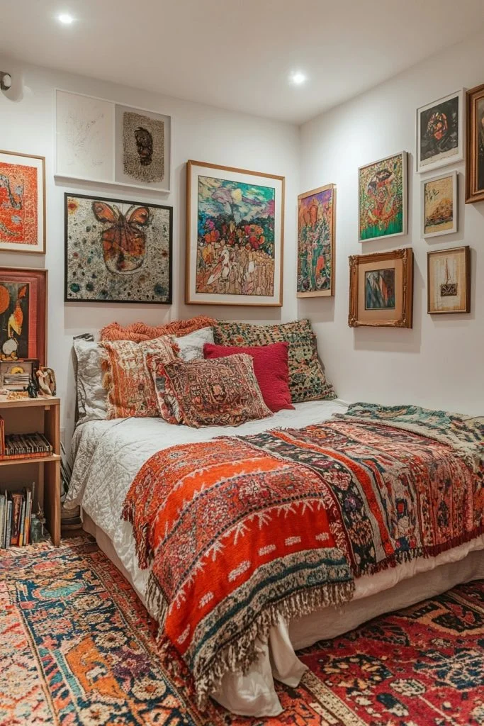 An Eclectic Art Haven in a small maximalist bedroom combines various artistic styles and mediums to create a unique and personal space. Walls adorned with an array of paintings, prints, and textiles turn the room into a gallery of wonders, where art is the focal point. This design celebrates diversity and personal expression, making the small space feel curated and special. The use of art to cover much of the visible space also helps to distract from the room’s size, instead offering endless visual interest.