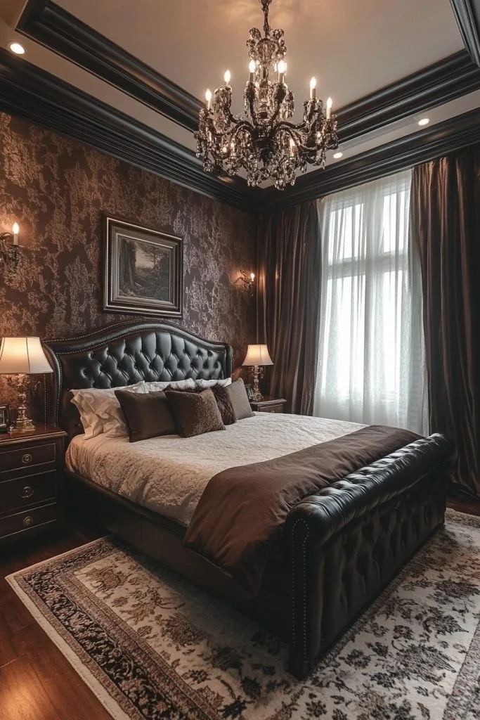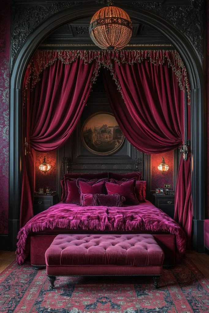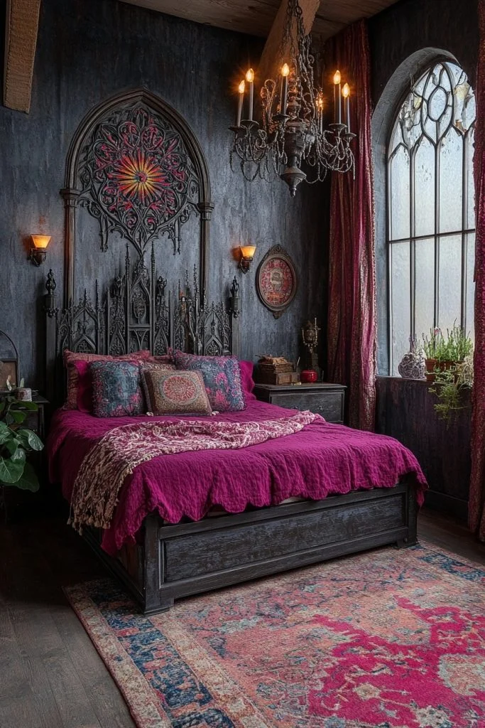 Neo-Gothic Drama in a small maximalist bedroom plays with dark colors, luxurious textures, and dramatic decor to create a mysterious and intimate atmosphere. This style embraces the grandeur of gothic architecture and design but scales it down to fit a smaller space without overwhelming it. Key elements include pointed arches, rich fabrics like damask, and ornamental artwork that add depth and interest to the bedroom. Strategic lighting can highlight these features, enhancing the room’s dramatic flair.