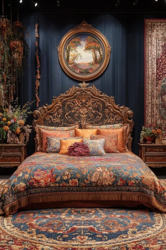 Rich Velvet Dreams in a small maximalist bedroom can transform the space with deep, luxurious textures that invite touch and add visual depth. Using velvet in bold colors for drapes, upholstery, or bedding creates a sumptuous atmosphere that feels both regal and cozy. This fabric not only enhances the room’s aesthetic but also works well to absorb sound, making the bedroom a quiet, serene haven. Velvet’s plushness contributes significantly to the maximalist appeal, emphasizing opulence in every detail.