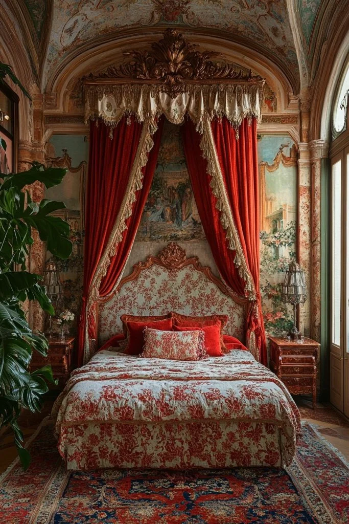 Modern Baroque Style combines traditional opulence with contemporary design in a small maximalist bedroom. This approach uses classic baroque elements like curved lines and rich embellishments in a modern color palette and layout. The result is a bold, dramatic space that feels both timeless and fresh. Statement furniture and lavish textiles underscore the maximalist approach while ensuring the bedroom remains stylish and functional, blending historical grandeur with modern flair.