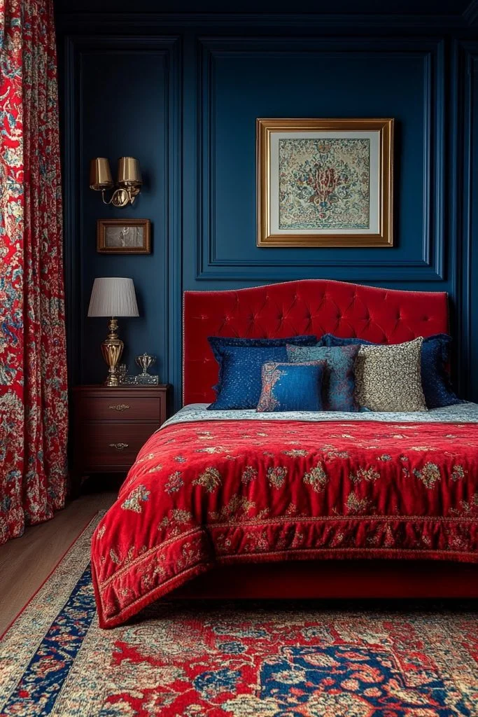 Regal Red and Blue in a small maximalist bedroom uses a bold color scheme to create a striking and dynamic environment. This powerful combination evokes a sense of luxury and depth, with rich reds and deep blues dominating the decor. Luxurious textiles and ornate patterns in these colors can transform the space into a royal chamber, enhancing the room’s small dimensions with their intensity. This style is perfect for those who want a bedroom that makes a strong visual statement.