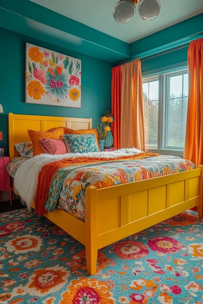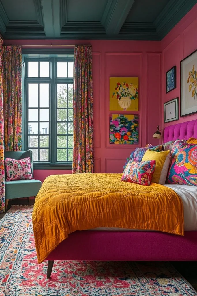 Exuberant Color Clash in a small maximalist bedroom celebrates the vibrant mixing of colors that might traditionally clash. This fearless approach uses bright, bold hues in unexpected combinations to create a lively and unique space. The clash of colors can visually expand the room by drawing the eye across various focal points, making it feel larger and full of energy. To balance the vivid colors, incorporate neutral flooring or simple furniture pieces.