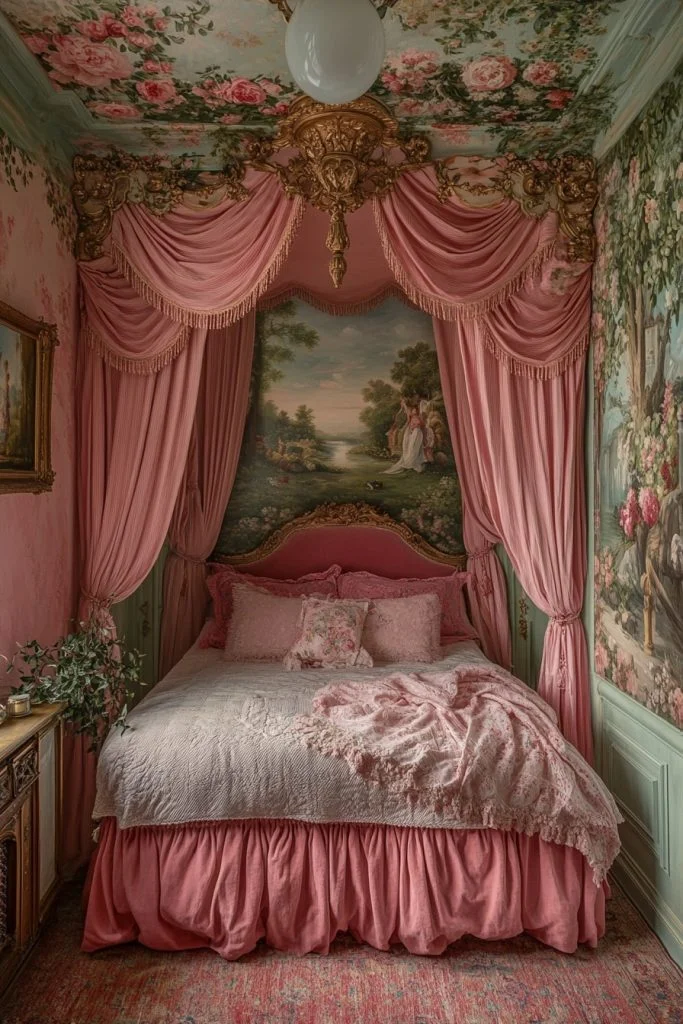Fantasy Fairy Tale in a small maximalist bedroom creates a whimsical and enchanting space, using elements like whimsical patterns, soft pastels, and luxurious fabrics. This theme invites you to indulge in childhood fantasies with a sophisticated twist, featuring fairy-tale inspired decor that captures the imagination. Plush bedding, ornate furniture, and magical lighting can turn a small room into a dreamy escape. The maximalist approach allows for creative freedom in mixing textures and colors, building a unique and personal sanctuary.