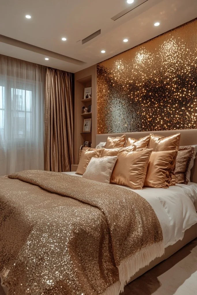 Metallic Mosaic in a small maximalist bedroom incorporates small metallic tiles or panels to create a sparkling mosaic effect. This design can be applied to a feature wall or accessories, reflecting light and adding an artistic element to the room. The shimmer of metal adds a touch of luxury and can visually expand the space by bouncing light around the room. Combining different metallic shades like gold, silver, and bronze can enhance the mosaic’s visual impact.