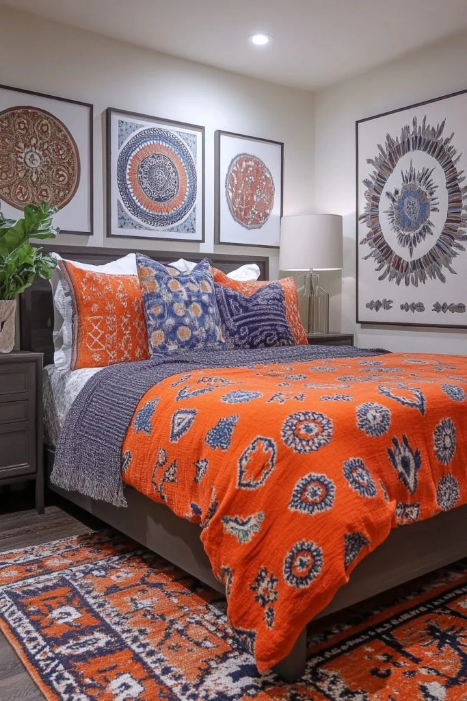 Bright Bohemian Rhapsody in a small maximalist bedroom mixes various patterns, colors, and textures to create a vibrant and eclectic space. This style is all about freedom of expression and layering different elements to achieve a cozy, informal look. Bright colors and diverse materials keep the eye moving around the room, making it feel larger and full of life. Handcrafted items and unconventional decor enhance the bohemian feel, making the bedroom a personal retreat.
