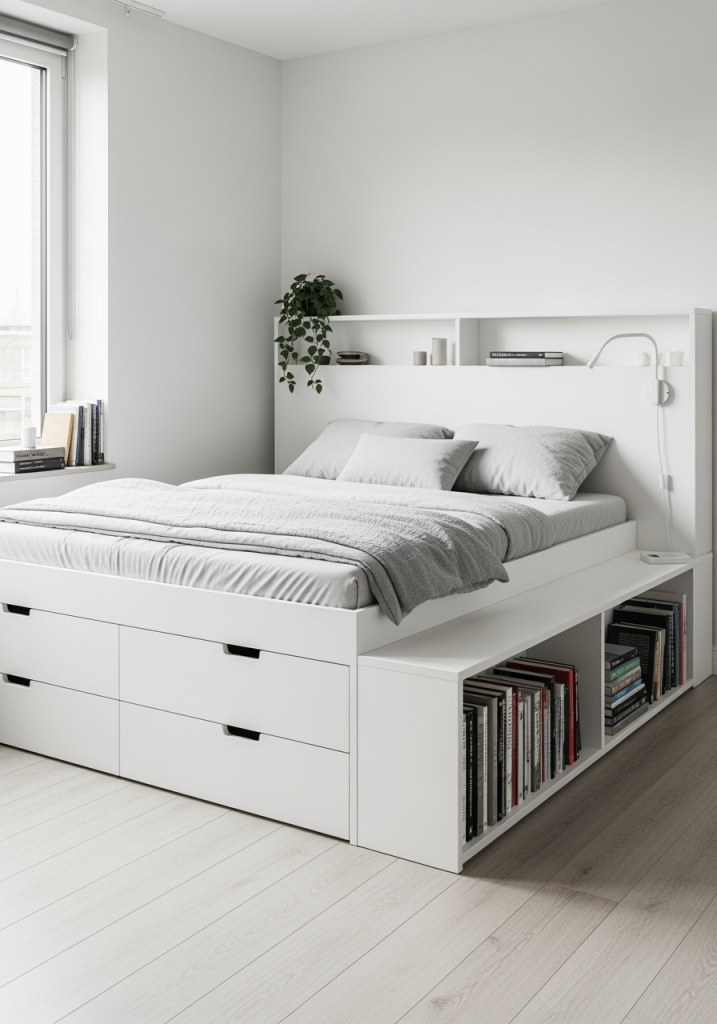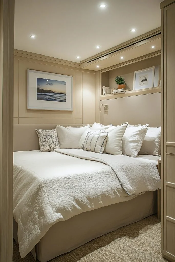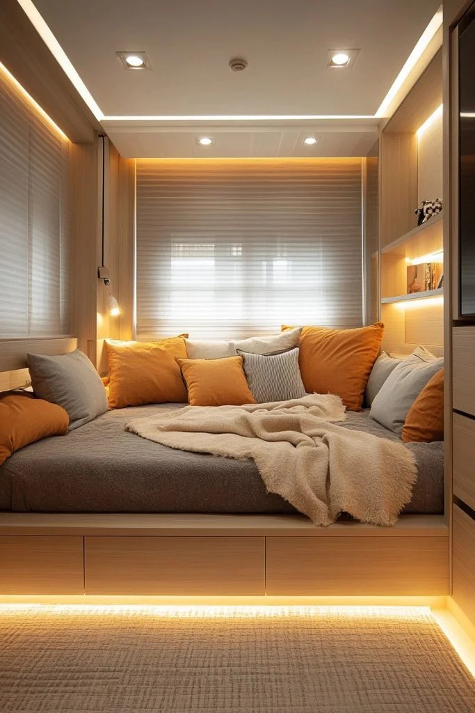 Soft Lighting Sanctuary emphasizes the importance of lighting in a tiny bedroom, using various light sources to enhance the room’s aesthetic and functionality. Soft, ambient lighting can make the space feel warm and cozy, while task lighting is practical for reading or working. The decor is simple and soothing, with light colors and minimal furniture to maximize the perception of space. This approach is ideal for those who want to transform their bedroom into a tranquil retreat.
