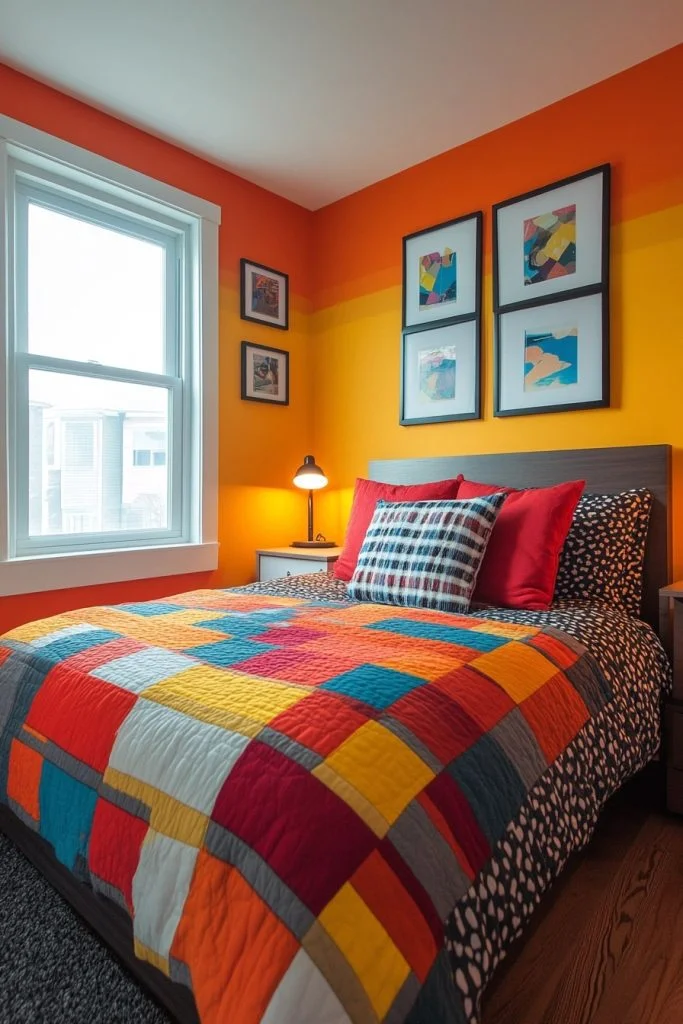 Geometric Harmony Hideaway utilizes shapes and patterns to create a dynamic and visually interesting tiny bedroom aesthetic. This style employs geometric prints on textiles like bed covers and curtains to add personality and movement without overwhelming the space. Furniture is functional and often features sharp, clean lines that echo the geometric theme. The careful balance of colors and shapes can help distract from the limited space, making the bedroom feel larger and more open.