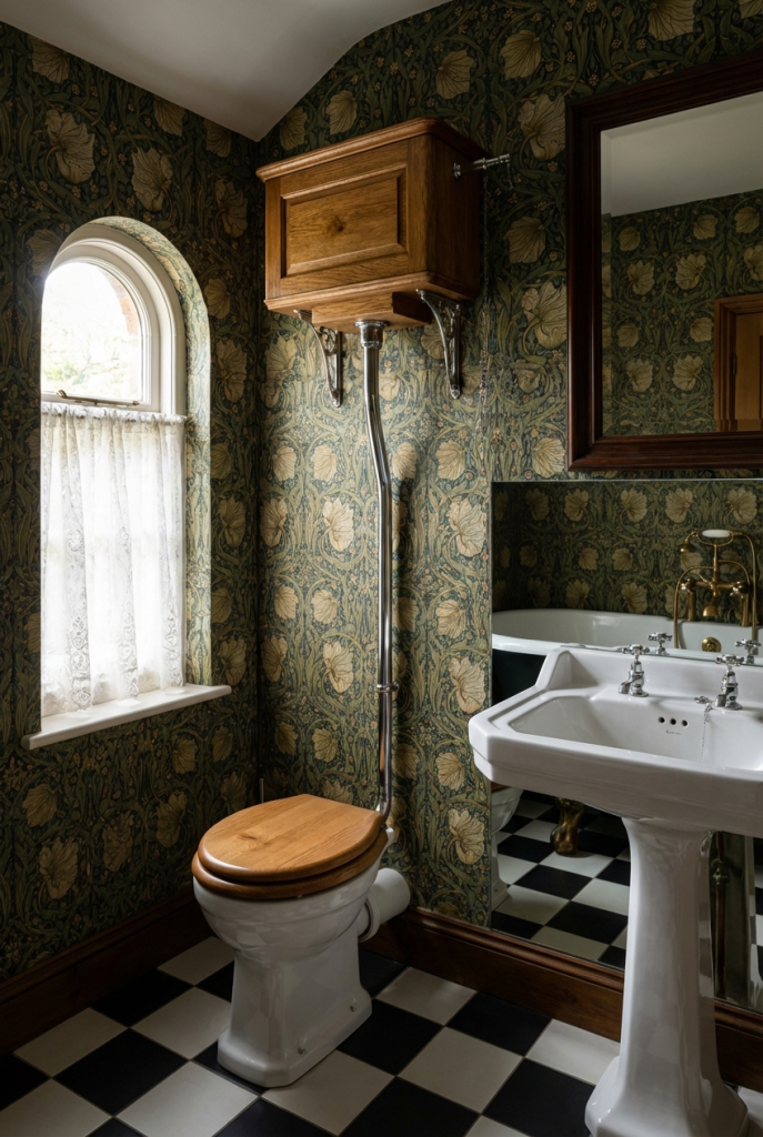 For a truly authentic Victorian feel, consider installing a high-tank toilet. This classic fixture features the water tank mounted high on the wall, connected to the bowl by a long, exposed pipe, usually in brass or chrome. It is a functional conversation piece that instantly anchors the room in the 19th century. While it looks antique, modern reproductions offer efficient flushing technology, giving you the best of both worlds—historical accuracy and modern performance.