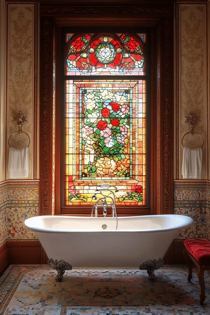 Incorporating stained glass adds both color and historical elegance to the space. Designs often feature floral or abstract motifs common in the Victorian era, serving as a privacy window or a decorative element. The light filtering through the stained glass casts colorful reflections across the room, enhancing the ambiance. Pairing this with polished wood and traditional fixtures completes the look.