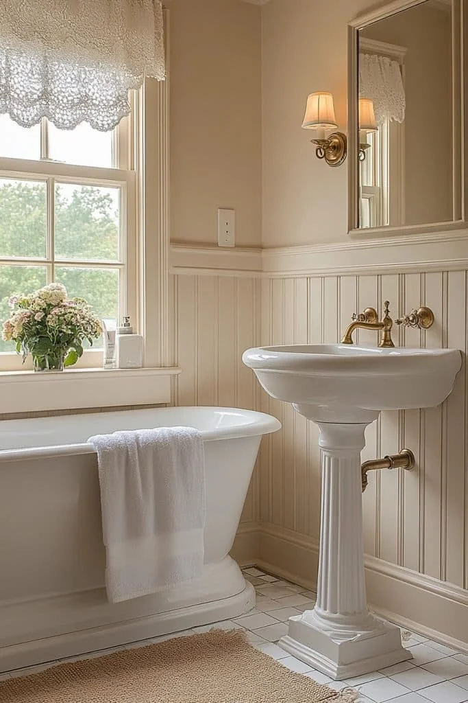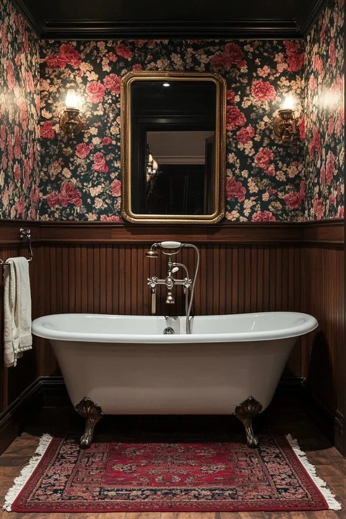 Beadboard wainscoting is an effective way to add architectural detail. It protects the lower section of the walls from moisture while adding a decorative element that is both functional and stylish. Painting the beadboard in period-appropriate colors like deep greens, blues, or creams can complement the overall color scheme. Pairing this with floral wallpapers above the wainscoting enhances the aesthetic.