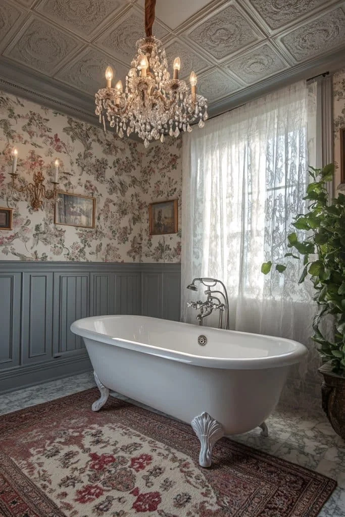 Chandelier lighting is a dramatic addition, providing both illumination and a decorative focal point. Crystal or glass chandeliers add a touch of luxury, especially when placed above a clawfoot tub. The reflective surfaces of the chandelier enhance light distribution and complement other period elements like mirrors and polished fixtures. Soft wall sconces can add additional layered lighting.