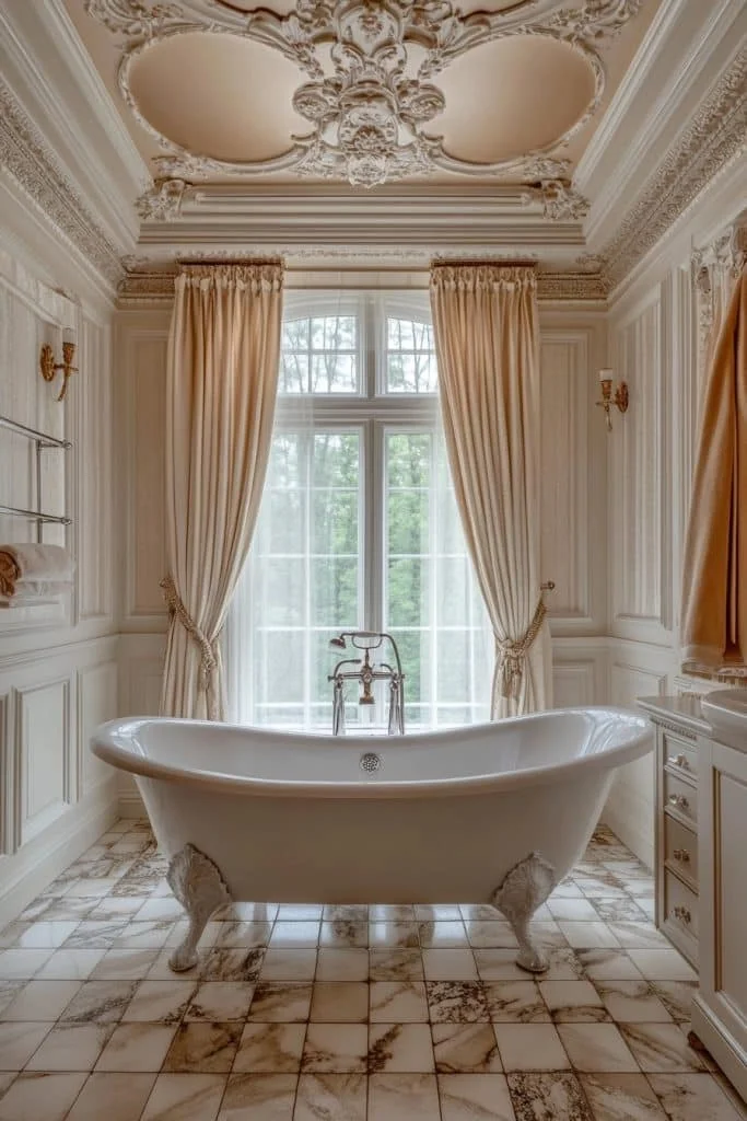 Decorative cornices are an elegant addition, framing the ceiling and adding architectural interest. These can be highlighted with contrasting paint colors or gold leaf for a more opulent look. Pairing decorative cornices with medallion ceiling tiles or intricate light fixtures enhances the character of the bathroom. This design element works well in larger bathrooms where the cornices can be shown to their best advantage.