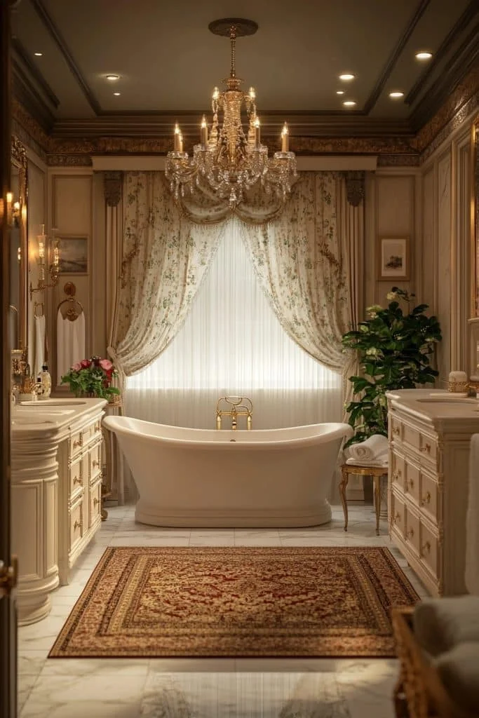 A Grand Victorian Ballroom Bathroom is designed to impress, using high ceilings, sweeping curtains, and dramatic lighting to recreate the grandeur of a ballroom. This space might feature a large freestanding tub, dual vanities, and an area for seating. Ornate details such as plaster moldings, silk wall coverings, and crystal chandeliers enhance the aesthetic. This type of bathroom is perfect for those who desire a lavish and expansive bathing environment.