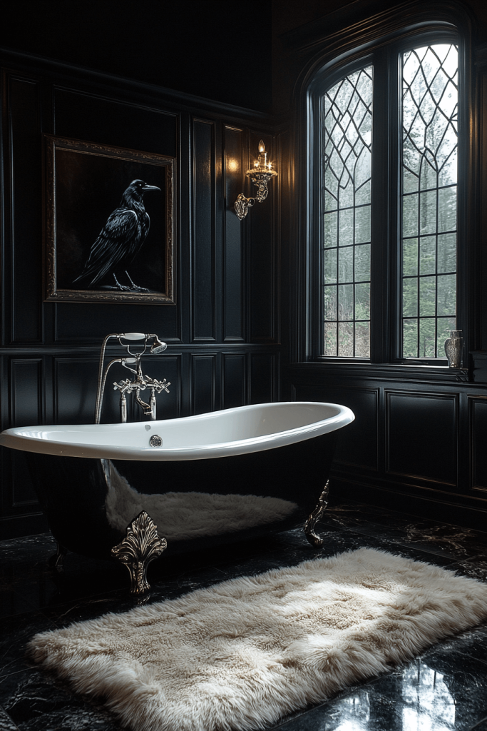 Embrace the mystery and intelligence of the raven with a Raven’s Refuge bathroom. Dark, glossy surfaces reflect light like a raven’s feathers, while accents in silver or pewter mimic the bird’s glinting eyes. A statement piece, such as a sculpted raven statue or themed artwork, can serve as a focal point. Soft, plush rugs and towels provide comfort and warmth.