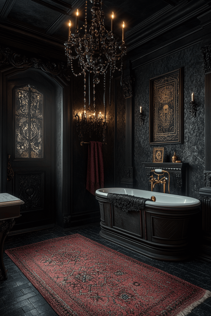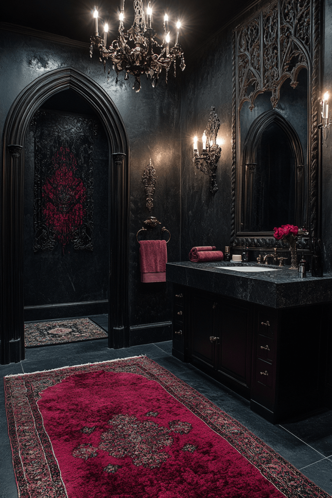 The Gothic Glamour bathroom blends classic gothic elements with modern flair. High contrast between dark walls and gleaming accessories creates a dramatic effect. Architectural details like pointed arches or stained glass can be incorporated for a historical touch. Luxurious textiles and a crystal chandelier provide a sense of decadence, balancing the somber tones with sparkle and shine.