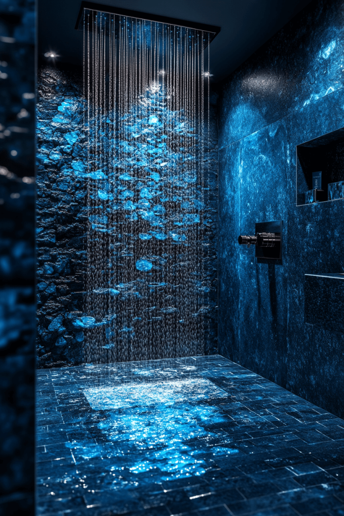 The Darkwater Domain is all about the power and beauty of water in a dark setting. Black or deep blue tiles create an aquatic feel, enhanced by waterfall faucets or a rain shower. Reflective surfaces like glass or polished metal can mimic the shimmering properties of water. Ambient, blue-toned lighting adds to the underwater illusion.